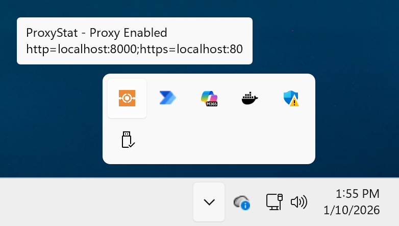 ProxyStat is now available for Windows! Just like on macOS, ProxyStat shows when you have a system proxy configured. When you enable a system proxy, the ProxyStat icon in the system tray turns orange and shows you the proxy address.